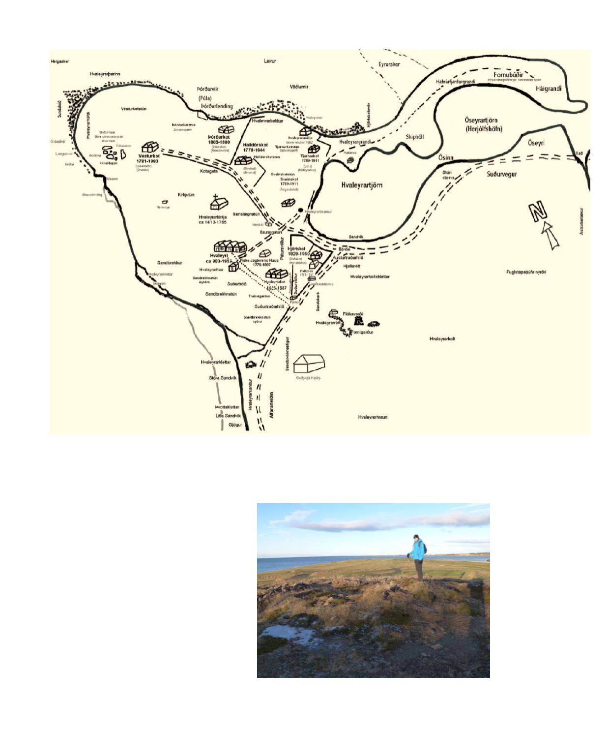 gamla Hvaleyrarbæjarins á efsta leitinu sem kalla má bæjarhól. Við göngum í átt að bæjarstæðinu. Næst verður